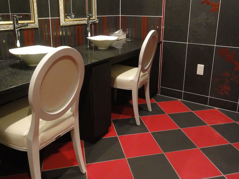 「仮面舞踏会」をコンセプトに、外来トイレを赤と黒をベースにデザイン。高齢者で寝たきりの方も多い病院だからこそ、お見舞いに来る家族やお孫さんが楽しめる空間にという配慮から生まれました。