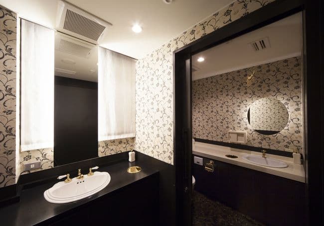 病院のトイレというと冷たいタイルでクリーム色のイメージですが、ここでは、黒やゴールドを使い、エレガントに演出しています。