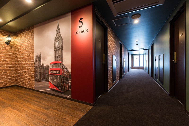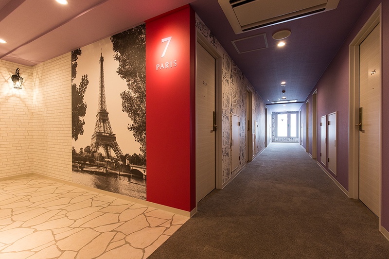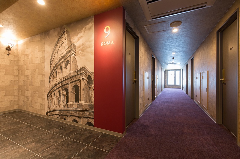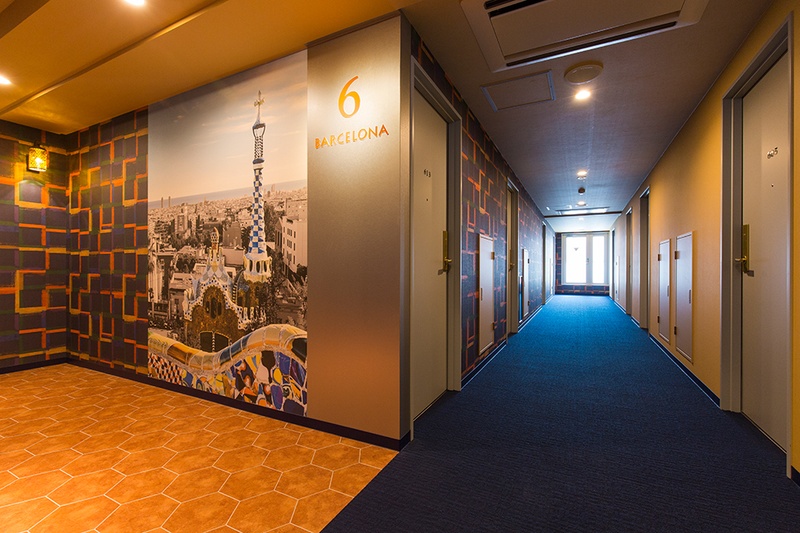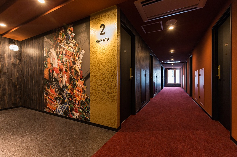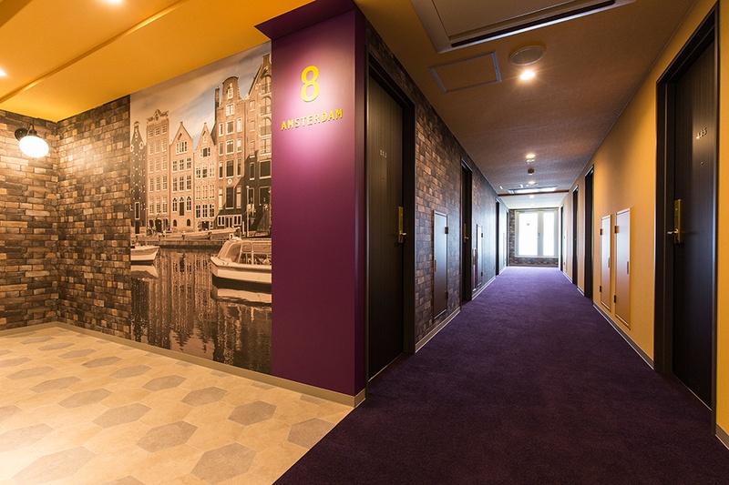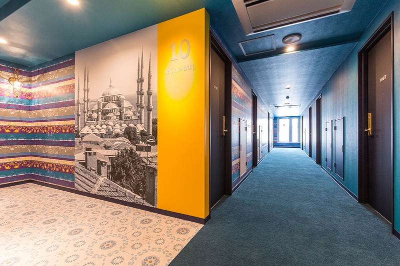 ワンフロアごとに異なる都市をテーマにデザイン。ニューヨーク、メキシコ、ロンドン、アムステルダム、パリ、ローマ、イスタンブール、バルセロナ、博多。エレベーターホールから客室まで、各都市の色彩と空気感が一貫して表現されています。博多のフロアでは、博多織りの柄をモチーフにしたデザインで地元の文化を取り入れました。