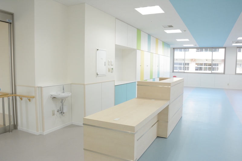 職員ルームは「癒しの森」をテーマに、森の中で仕事をするような空間にデザイン。さらに倉庫や汚物処理室といったバックヤードにも、スタッフが元気になれるデザインを施しました。患者さんのケアを担うスタッフが、まず自分自身が元気でいられること。それが良い医療につながるという考え方です。