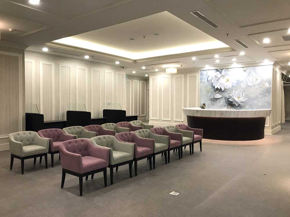 総合受付フロアはシックな色合いで落ち着きを、一般の待合室は心穏やかに過ごせる色彩配慮を。一方、VIPラウンジ・VIP診察室・VIP診察室廊下には、一般フロアとは明確に異なるグレードの空間を。素材と色彩で「格」の違いを表現し分ける計画を事前に立てました。