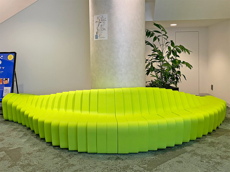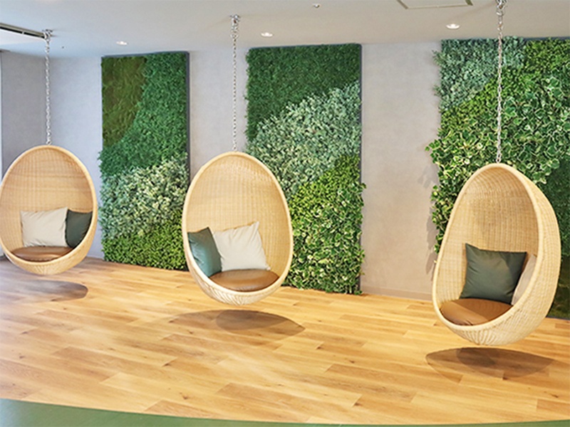 患者さんが過ごす待合室や特別室だけでなく、8階のスタッフ休憩コーナーにもこだわりました。吊チェア、壁面緑化、シンボルツリーを囲むベンチ、多彩なデザインの椅子。働く人が森で休んでいるような空間を構想し、スタッフの心身のリフレッシュを空間で支える方針を固めています。