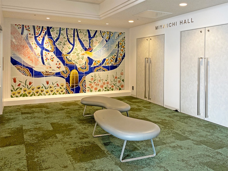 1階の岸辺、2階の宇宙、3階の大地、8階の空と森。砥部焼の陶板焼きアート、オリジナル制作の絵画、壁面緑化、オリーブの木が植えられたガーデン。MUSEOというコンセプトのもと、病院全体が一つの美術館になる。それが隈病院のインテリアデザインです。