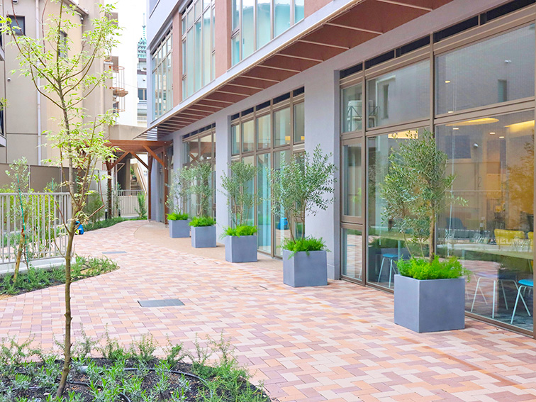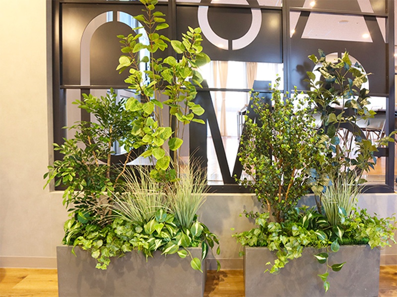 8階のスタッフ休憩コーナーは「空と森」がテーマ。壁面緑化した一角に吊チェアコーナーを設け、森で休んでいるような演出を。中心にはシンボルツリーを囲むベンチで、木陰で休む体験を。多彩なデザインの椅子を用意し、好きな場所でコーヒーブレイクができます。食堂との仕切りには特別にデザインしたアイアンで、視線を交わしながらつながりのある空間をつくりました。