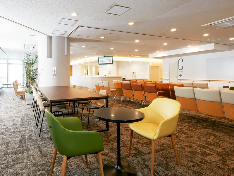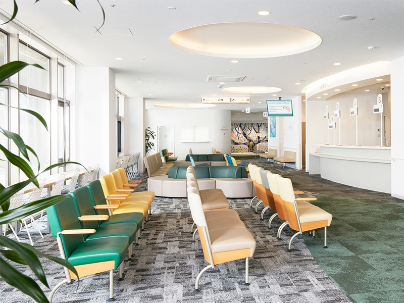 白い壁を残さないという方針のもと、オリジナル制作のアートをインテリアに合わせてセッティング。1階ホール前には砥部焼の山田先生作の陶板焼き(樹木と幸せの鳥のカップルがコンセプト)。エレベーターホールの椅子はアートオブジェのように配置。天井高7mの1階ホールにはモスグリーンの絨毯で自然を感じさせ、病院の歴史がわかる展示コーナーと大スクリーンも備えています。屋外には患者さんが楽しめるガーデンを設け、オリーブ、楓フラミンゴ、ラベンダー、ローズマリーを植えた癒しの庭に。