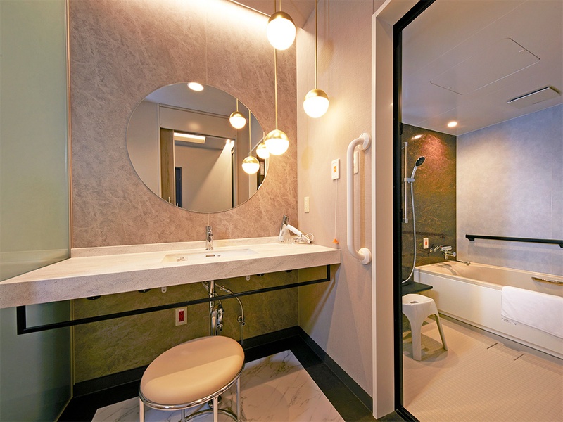 増築棟に誕生した特別室2室。玄関を開けると前室があり、ホテルの雰囲気を出すために床のデザイン、間接照明、アートを工夫しました。ベッドヘッドの酸素吸引セットは隠れるように設計し、木目で緊張感をなくす配慮を。パウダールームは大理石柄の人造石カウンターに丸いミラーとペンダントライト。5階ラウンジはエレガントな色彩と間接照明、鏡のかたちにこだわり、特室ゾーンの入口にふさわしい空間に仕上げています。