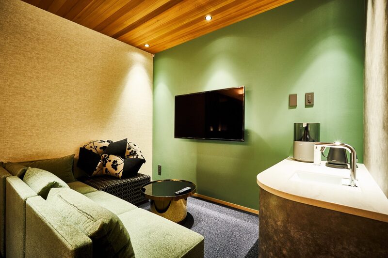 【鳥の間】 鳥のアート「ちどり」を中心に、澄んだ空気、差し込む光、大樹、昼と夜の新緑をイメージ。自然の生命力を感じるパーティーシンク付きソファコーナーを配しています。