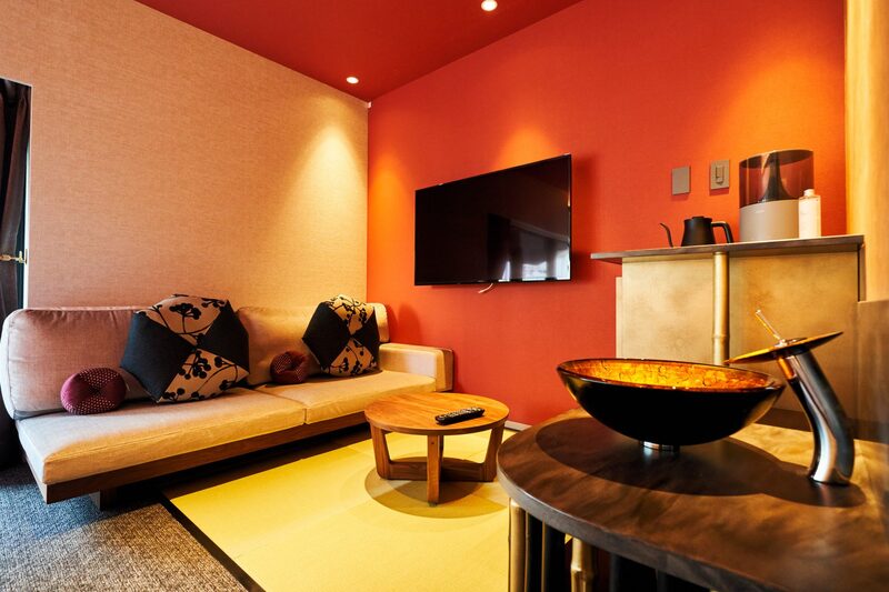 平安時代をテーマにしたアート、優雅なプライベートバス、帯でつくったオリジナルのベッドスロー。