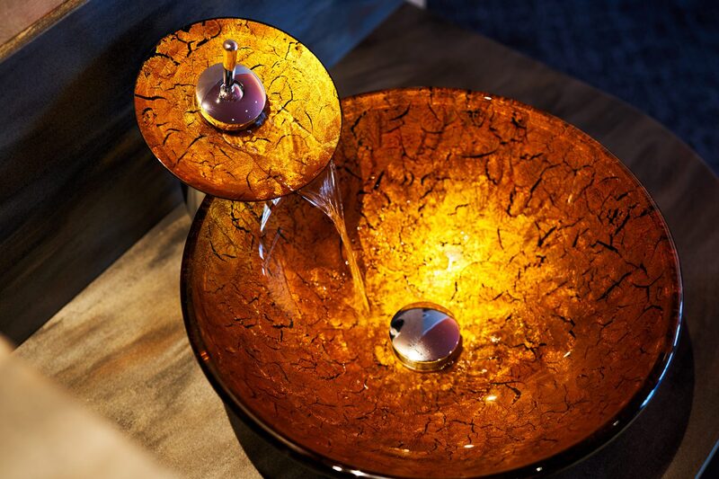 竹をモチーフにしたガラスモザイクを配したパウダーコーナー、竹をイメージしたバスルーム。