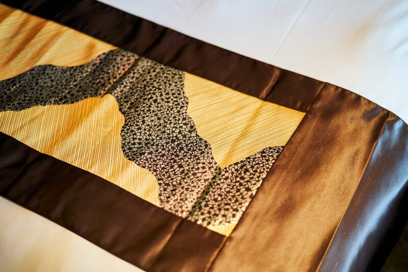 3室すべてに、花鳥風月をテーマにした帯でつくったオリジナルのベッドスローを配置。既製品にはない、このホテルだけの特別な演出です。