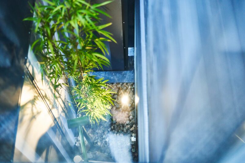 バルコニーから眺められる坪庭は、京都の四季を感じられる小さな庭園。客室の内と外をつなぎ、季節の移ろいを空間に取り込む仕掛けです。