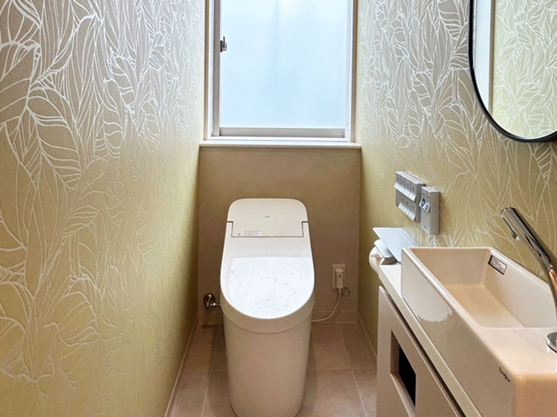 丸みのあるミラーをアクセントに、植物柄に包まれるリラックス空間。