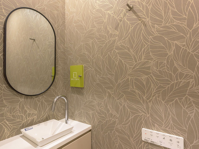 スタッフトイレにもグリーンの葉っぱ柄壁紙でガーデンをイメージしたデザインを施し、コンパクトなスペースでも機能的に使えるよう手洗いカウンターの設計まで検討しています。