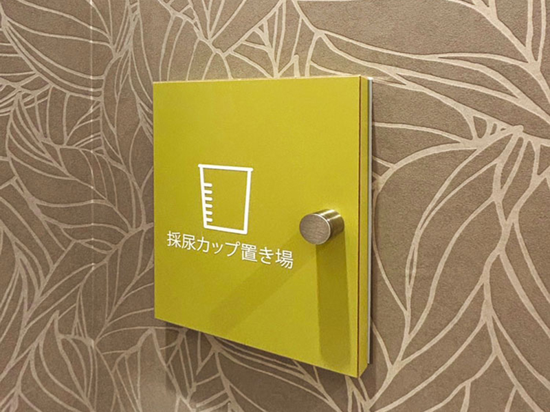 採尿カップ置き場には若葉をイメージした黄緑色の扉をつけ、細部にまで患者さんへの配慮を行き届かせています。