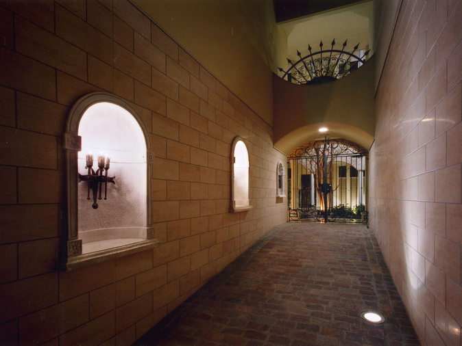イタリアの街歩きのような楽しさを表現するため、駅からの帰り道もデザインの一部と捉えました。敷地にたどり着くと、まず滝がお出迎え。